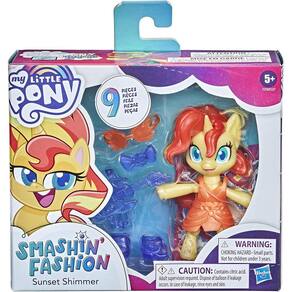 Esses pôneis estão estourados! Smashin' Fashion set apresenta poseable Sunset Shimmer figura pônei que está tão pronto para aventuras selvagens e loucas. Pony vem com 7 peças de moda, incluindo 1 acessório escondido! Coloque o Smashin' Pack em uma superfície plana e esmague-o para vê-lo expandir, então POP! A bolsa vai estourar para revelar um acessório de moda inspirado em personagens e balão de amizade. A figura de Sunset Shimmer vem com acessórios de moda inspirados em estrelas do rock para imaginar que ela está se preparando para um grande show. Inclui guitarra, botas, óculos de sol, arco de cabelo e 2 vestidos de estrela do rock. Um vestido está escondido dentro do Smashin' Pack para uma revelação emocionante de unboxing! Procure também Twilight Sparkle e Rainbow Dash para misturar e combinar looks incríveis, em seguida, começar a se mover em aventuras emocionantes com os amigos! (Cada um vendido separadamente. Sujeito à disponibilidade.) This My Little Pony: Pony Life-inspired toy is for girls and boys ages 5 year and up. Meu Pequeno Pônei e todos os personagens relacionados são marcas registradas da Hasbro.