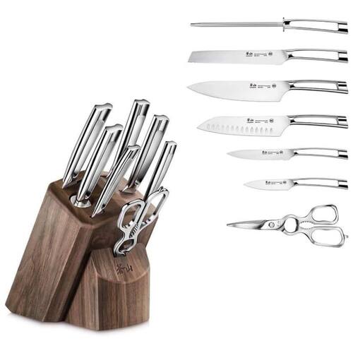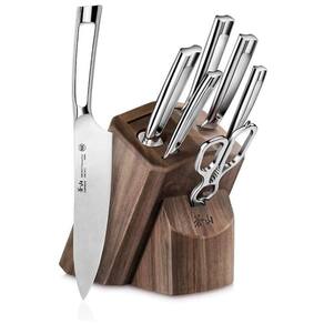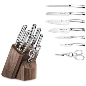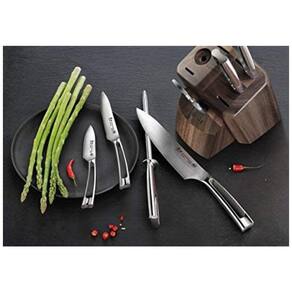 Facas full tang feitas à mão, forjadas em aço alemão de grão fino, X50CrMoV15, para durabilidade incrível, resistência a manchas e retenção de borda excepcional. Projetado para ajudá lo a realizar uma variedade de tarefas de corte com facilidade e confiança, este conjunto inclui as facas de cozinha mais comuns, bem como algumas facas especiais para trabalhos de preparação mais avançados. NSF International Certified. Garantia vitalícia contra defeitos de fabricante. Lave as facas com água morna e um pouco de detergente, enxágue com cuidado e seque com uma toalha Marca: Não Informado