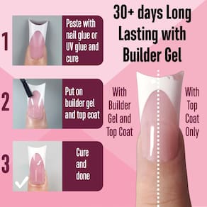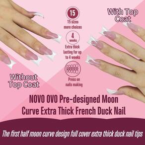 Cada produto inclui um total de 150 pontas de unhas de 15 tamanhos, 10 pontas por tamanho Modo de uso: salão profissional ou faça você mesmo - Obtenha uma simples peça de unha de pato com ponta francesa com apenas 3 etapas: as unhas pré-projetadas da NOVO OVO estão aqui para tornar sua manicure mais fácil! Já aplicamos um primer de ponta e uma camada de base nas pontas das unhas de gel macio. Basta colá-las nas unhas com gel UV ou cola e, em seguida, adicionar uma camada de gel construtor e camada superior. Em apenas 15 minutos, você terá incríveis unhas de pato French Tips em sua mão! - Dicas para unhas de pato curvadas da primeira lua do mundo: após 8 tipos de pontas de unha de pato diferentes ou formas duplas, da meia cobertura à cobertura total, de comprimento curto a médio, longo, GG. Projetamos estas pontas de unhas de pato com curva lunar para eliminar a necessidade de lixamento demorado, permitindo que você crie facilmente designs deslumbrantes. Seja você um artista de unhas profissional ou um entusiasta de bricolage, este produto revolucionário certamente simplificará seu processo de design de unhas e aumentará sua criatividade. - Pontas de unha de espessura dupla feitas com gel macio: estas pontas de unhas de qualidade premium apresentam um acabamento extragrosso na borda livre, tornando-as 2-3 vezes mais resistentes do que as opções padrão, o que ajuda a reduzir os custos de reforço. Elas são fáceis de pressionar, aparar e pintar, e são compatíveis com esmalte, pó de imersão e pó acrílico, permitindo que você faça manicure de qualidade de salão e unhas de pressão. Além disso, elas são absorvidas facilmente, eliminando preocupações com excesso de lixamento durante a remoção da extensão. - Várias opções de tamanhos para o melhor ajuste: nossas pontas de unha vêm em 15 tamanhos diferentes para atender a uma variedade de tamanhos de dedos, 5 opções para o polegar e especialmente amigáveis para aqueles com camas de unhas largas ou pequenas. Portanto, não importa se você tem dedos grandes ou pequenos, você pode encontrar o ajuste perfeito em nossas dicas. E é mais fácil para salões profissionais criar manicures deslumbrantes e perfeitamente ajustadas ou aplicar unhas de pressão. - Unhas de pato médias ou longas para a maioria dos usos: nossas pontas de unha são projetadas exclusivamente com um comprimento médio, oferecendo o máximo conforto para o uso diário. Seu comprimento mais longo é de cerca de 1,2 polegada (33,5 mm), no entanto, as pessoas às vezes chamam de longo ou G. Se você preferir um comprimento mais curto, basta arquivá-los no tamanho desejado enquanto ainda mantém sua forma distinta de flare.