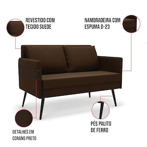 Que tal a Namoradeira Mari? Imagine-se utilizando esse produto e usufruindo de todos os benefícios que ela oferece. Usar essa Namoradeira é bem simples! Pode ser utilizada para evidenciar e enriquecer o seu ambiente, descansar depois de um dia longo de trabalho, ver aquela série favorita ou simplesmente ler seu livro predileto. Sua estrutura é confeccionada em madeira de eucalipto proveniente de reflorestamento, suportando em média até 120 Kg, possuí Pés Palito de Ferro, garantindo uma maior resistência e durabilidade ao produto, o estofamento do assento e encosto é composto de espuma D-23, revestido em tecido Suede no tom Marrom. Então, se a sua dificuldade é a otimização de espaço, esta namoradeira além de confortável e sofisticada, traz toda a funcionalidade que você precisa. Apenas algumas unidades estão disponíveis, separe o sua Namoradeira Mari antes que acabem! Dimensões da Namoradeira: Altura total: 82 cm Largura total: 110 cm Profundidade total: 74 cm Altura do encosto: 35 cm Largura do assento: 104 cm Profundidade do assento: 57 cm Altura do chão ao assento: 47 cm Espessura do assento: 22 cm Altura do chão ao braço: 46 cm Altura interna do braço: 19 cm Tamanho dos pés: 25 cm Espessura do braço: 4 cm Peso: 20 kg Dimensões da Almofada: Altura total: 34 cm Largura total: 51 cm Profundidade total: 20 cm Peso: 0,3 kg Especificações do Produto Estrutura: Madeira Eucalipto Espuma: D-23 Tecido: Suede Tipo de pés: Pés Palito de Ferro Peso suportado: Até 120 Kg Garantia: 90 dias contra defeito de fabricação Montagem: O produto vai montado, apenas rosquear os pés Instruções de limpeza: Utilizar um pano limpo e levemente úmido Você irá receber: 01 Volume com 01 Namoradeira Observações Relevantes - Todos os produtos vão embalados com total segurança; - As cores dos produtos podem sofrer alterações dependendo do seu monitor; - Para futuras compras, não garantimos a mesma tonalidade de cor, pois existe variação a cada lote do fabricante do tecido; - As imagens são meramente ilustrativas, não acompanham objetos de decoração e eletros; - Confira as dimensões do produto no momento da compra e certifique-se de que passará normalmente por escadas, elevadores, portas e corredores; - Importante: Por se tratar de estofado as medidas podem ter uma pequena variação em até 3 cm; - Não nos responsabilizamos no ato da entrega por montagens, desmontagens, instalações de produtos; - Não nos responsabilizamos no ato da entrega por subir escadas, elevadores, nem utilização de guinchos ou equipamentos similares para acesso a pisos superiores em apartamentos; - A entrega do produto é realizada em todo território nacional, até onde as rodovias alcançam, entregas fluviais ou aéreas devem ser cotadas a parte; - Observando as orientações acima, evita-se futuros desagrados ou imprevistos com a entrega do produto. Havendo despesas adicionais, serão de responsabilidade do cliente;