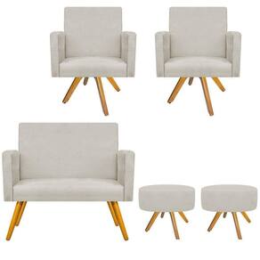 Gostaria de um móvel que trouxesse mais elegância e sofisticação para o seu lar? O Kit Namoradeira, 02 Poltronas Beatriz e 02 Puff Sofia é sua melhor opção! Com característica moderna e com acabamento de qualidade, este produto atenderá suas expectativas! Não perca essa oportunidade e adquira já a sua! Especificações Técnicas da Namoradeira Decorativa Beatriz: - Altura: 82 cm; - Largura: 110 cm; - Profundidade: 58 cm; - Altura do Assento: 42 cm; - Largura do Assento: 100 cm; - Altura do Encosto: 45 cm; - Largura do Encosto: 100 cm; - Profundidade do Assento: 45 cm; - Espessura do Assento: 12cm; - Altura do Braço: 60cm; - Espessura do Encosto: 8cm; - Altura dos Pés: 30 cm; - Peso: 20 kg. - Peso Suportado: 120 kg. Especificações Técnicas da Poltrona Decorativa Beatriz: - Altura: 82 cm; - Largura: 60 cm; - Profundidade: 58 cm; - Altura do Assento: 42 cm; - Largura do Assento: 50 cm; - Espessura do Assento: 12 cm; - Altura do Encosto: 45 cm; - Largura do Encosto: 50 cm; - Espessura do Encosto: 8 cm; - Altura dos Pés: 30 cm; - Altura do Braço: 60 cm; - Peso: 20 kg. - Peso Suportado: 120 kg. Especificações Técnicas do Puff Decorativo Sofia: - Altura: 43 cm; - Diâmetro: 42 cm; - Espessura: 13 cm; - Altura dos Pés: 30 cm; - Peso: 10 kg. - Peso Suportado: 120 kg. Diferenciais do Kit Namoradeira, 02 Poltronas Beatriz e 02 Puff Sofia: - Material da Estrutura: fabricado com Madeira Pinus e Eucalipto Reflorestada, e alguns detalhes em MDF; - Tipo de Assento: estofado e com espuma de densidade D-26; - Tipo de Encosto: estofado e com espuma de densidade D-18; - Detalhes dos Pés: a namoradeira acompanha kit de pés de madeira, no estilo palito na cor mel e as poltronas e o puff acompanham base giratória de madeira (uma para cada produto), ambos com alta resistência; - Volumes: nessa compra você receberá UMA NAMORADEIRA, DUAS POLTRONAS E DOIS PUFF. ATENÇÃO: a transportadora pode entregá-los juntos ou separados, nesse último caso, inclusive com dias de diferença na entrega. Recomendações de limpeza: -Limpar com flanela limpa e seca. Não molhar o móvel e não expor em lugar úmido ou próximo de fontes de calor. Não usar produtos abrasivos. Observações Importantes: - As imagens ambientadas são meramente ilustrativas e podem apresentar itens que não compõe o produto; - Objetos decorativos que aparecem na foto não acompanham o produto; - As cores do produto podem variar de acordo com o monitor, a iluminação do ambiente, ou sua percepção visual; - Namoradeira Decorativa Beatriz chegará montada para você, bastando rosquear os pés; - A Poltrona Decorativa Beatriz chegará montado para você, bastando encaixar a base giratória; - O Puff Decorativo Sofia chegará montado para você, bastando encaixar a base giratória; - Confira as dimensões antes da compra e certifique-se de que o produto passará por elevadores, portas e corredores, já que nossa entrega não inclui a subida de lances de escada, ou o lançamento de produtos; - Ao receber seus produtos, verifique no ato do recebimento qualquer dano na embalagem. Caso tenha alguma avaria, favor não assinar o comprovante de recebimento (A transportadora tem obrigação de esperar a conferência); - Produto para uso residencial em ambiente interno, não devendo ficar exposto diretamente ao sol, calor e umidades excessivas.
