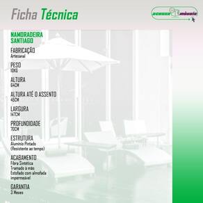 Namoradeira área Externa Alumínio Fibra Sintética Santiago Preto/verde Procurando sofisticacao ao seu ambiente? A Namoradeira Santiago e ideal para trazer conforto e sofisticacao ao seu ambiente. Fabricada com estrutura em aluminio e acabamento em fibra sintetica, oferece alta resistencia as condicoes climaticas, garantindo durabilidade e beleza por mais tempo. Seu assento e encosto sao estofado com tecido impermeavel proporciona maior conforto e praticidade, ideal para momentos de lazer e descontracao. Produzida de forma artesanal, a namoradeira Santiago combina elegancia e exclusividade no design. E uma excelente opcao para areas gourmet, espacos externos, churrasqueiras, ediculas e outros ambientes que pedem charme e aconchego.