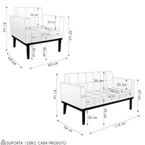 O Sofá Namoradeira e a Poltrona Para Sala são revestidos em Bouclé, que é confortável, suave ao toque, e valoriza o design das peças. Eles têm braços e encosto em espuma D-18 e assento em espuma D-26, que oferecem firmeza e aconchego para você relaxar. A base em madeira de eucalipto castanho é um detalhe charmoso, que dá um toque rústico e sofisticado ao conjunto. O kit tem uma estrutura resistente e suporta até 120 kg cada peça. A montagem é simples, pois as peças já vêm prontas, bastando fixar a base com os parafusos que acompanham o produto. A limpeza é prática, pois basta usar um pano limpo e levemente úmido, sem produtos abrasivos, para manter o seu kit sempre em bom estado. Hora de transformar seu ambiente com a Namoradeira 2 Lugares e a Poltrona para Sala deixando ainda mais confortável e estiloso.