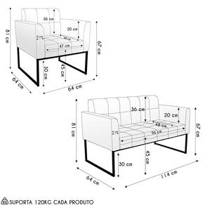 O Sofá Namoradeira e a Poltrona Para Sala são revestidos em Bouclé, que é confortável, suave ao toque, e valoriza o design das peças. Eles têm braços e encosto em espuma D-18 e assento em espuma D-26, que oferecem firmeza e aconchego para você relaxar. A base industrial é um detalhe charmoso, que dá um toque moderno e sofisticado ao conjunto. O kit tem uma estrutura resistente e suporta até 120 kg cada peça. A montagem é simples, pois as peças já vêm prontas, bastando fixar a base com os parafusos que acompanham o produto. A limpeza é prática, pois basta usar um pano limpo e levemente úmido, sem produtos abrasivos, para manter o seu kit sempre em bom estado. Hora de transformar seu ambiente com a Namoradeira 2 Lugares e a Poltrona para Sala deixando ainda mais confortável e estiloso.