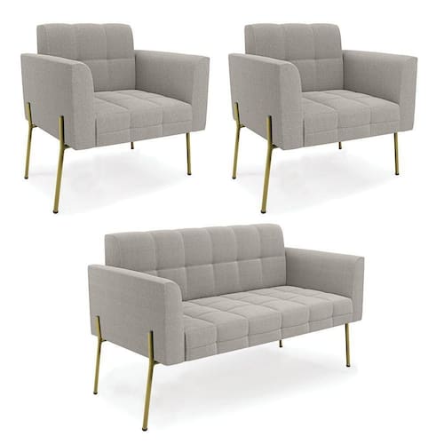 O Sofá Namoradeira e 2 Poltronas Elisa é uma mobília que combina elegância, conforto e durabilidade. Ele tem um design retrô e sofisticado, com Pés Laterais de Ferro Dourado e revestimento em tecido Bouclê Cinza, que harmonizam com qualquer ambiente. Ele é ideal para sala de estar, recepções, escritórios, cozinhas ou qualquer outro espaço que você queira decorar com estilo e bom gosto. Ele tem uma estrutura em madeira de reflorestamento eucalipto, que garante a resistência e a sustentabilidade do produto. Ele suporta até 180 kg de peso, podendo ser utilizada por pessoas de diferentes biotipos. Ele tem um acabamento reforçado e espuma de qualidade D23, que oferece maciez e aconchego. Ele contém detalhes de costura no encosto e assento, resultando em um acabamento impecável, conferindo muito mais valor e elegância ao produto. O Sofá Namoradeira e 2 Poltronas Elisa é um móvel de alta qualidade, beleza e funcionalidade. Ele é fácil de transportar, pois tem um peso leve e um tamanho compacto. O Sofá Namoradeira e 2 Poltronas Elisa é um produto que vai fazer a diferença na sua decoração e no seu bem-estar. Ele vai trazer charme, conforto e durabilidade para o seu ambiente. Aproveite essa oferta e leve para casa um Sofá Namoradeira e 2 Poltronas de qualidade por um preço incrível. Essa é a sua chance de ter um Sofá Namoradeira e 2 Poltronas maravilhoso por um preço imperdível. Corra e garanta o seu antes que acabe o estoque!