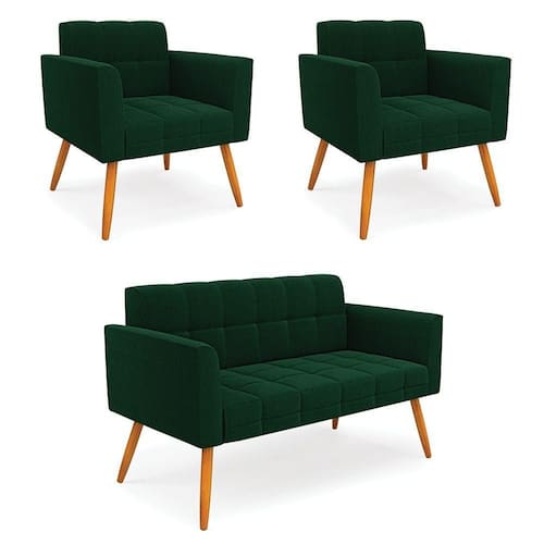 O Sofá Namoradeira e 2 Poltronas Elisa é uma mobília que combina elegância, conforto e durabilidade. Ele tem um design retrô e sofisticado, com Pés Palito Castanho e revestimento em tecido Bouclê Verde, que harmonizam com qualquer ambiente. Ele é ideal para sala de estar, recepções, escritórios, cozinhas ou qualquer outro espaço que você queira decorar com estilo e bom gosto. Ele tem uma estrutura em madeira de reflorestamento eucalipto, que garante a resistência e a sustentabilidade do produto. Ele suporta até 180 kg de peso, podendo ser utilizada por pessoas de diferentes biotipos. Ele tem um acabamento reforçado e espuma de qualidade D23, que oferece maciez e aconchego. Ele contém detalhes de costura no encosto e assento, resultando em um acabamento impecável, conferindo muito mais valor e elegância ao produto. O Sofá Namoradeira e 2 Poltronas Elisa é um móvel de alta qualidade, beleza e funcionalidade. Ele é fácil de transportar, pois tem um peso leve e um tamanho compacto. O Sofá Namoradeira e 2 Poltronas Elisa é um produto que vai fazer a diferença na sua decoração e no seu bem-estar. Ele vai trazer charme, conforto e durabilidade para o seu ambiente. Aproveite essa oferta e leve para casa um Sofá Namoradeira e 2 Poltronas de qualidade por um preço incrível. Essa é a sua chance de ter um Sofá Namoradeira e 2 Poltronas maravilhoso por um preço imperdível. Corra e garanta o seu antes que acabe o estoque!