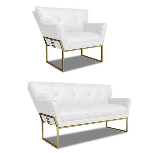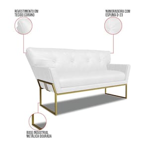 O Sofá Namoradeira e Poltrona Anitta é uma peça que combina beleza, conforto e funcionalidade. Ele tem um design contemporâneo, sofisticado e um revestimento em tecido Sintético PU Branco que harmonizam com qualquer ambiente. Possui uma base industrial dourada com um belo detalhe trabalhado no metal, que além de adicionar um toque de charme à peça, oferece um suporte sólido e seguro, garantindo conforto superior ao sentar. Ideal para sala de estar, recepções, escritórios ou qualquer outro espaço que você queira decorar com estilo e bom gosto. Produzido cuidadosamente em madeira de reflorestamento eucalipto, que garante a resistência e a sustentabilidade do produto. Ele suporta até 180 kg de peso, podendo ser utilizado por pessoas de diferentes biotipos. Ele tem um acabamento reforçado e espuma de qualidade D23, que oferece maciez e aconchego. A almofada fixa do encosto é revestida com fibra siliconada e conta com um detalhe elegante em botonê, que não só valoriza o design, mas também proporciona uma sensação de conforto inigualável. O encosto levemente triangular de ambos adiciona uma estética exclusiva, enquanto os braços, com delicados frisos na costura enriquecem ainda mais o produto. O Sofá Namoradeira e Poltrona Anitta é um kit de alta qualidade, sutileza e versatilidade. Ele é fácil de transportar, pois tem um peso leve e um tamanho compacto. O Sofá Namoradeira e Poltrona Anitta é um produto que vai fazer a diferença na sua decoração e no seu bem-estar. Ele vai trazer personalidade e inovação para o seu ambiente. Aproveite essa oferta e leve para casa um sofá namoradeira e poltrona de qualidade por um preço incrível. Essa é a sua chance de ter um conjunto atraente na sua decoração por um preço imperdível. Corra e garanta o seu antes que acabe o estoque!