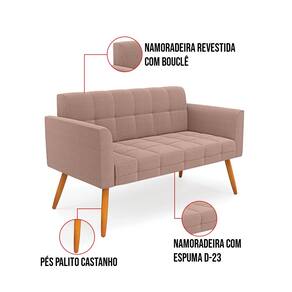 O Sofá Namoradeira e Poltrona Elisa é uma mobília que combina elegância, conforto e durabilidade. Ele tem um design retrô e sofisticado, com Pés Palito Castanho e revestimento em tecido Bouclê Rosê, que harmonizam com qualquer ambiente. Ele é ideal para sala de estar, recepções, escritórios, cozinhas ou qualquer outro espaço que você queira decorar com estilo e bom gosto. Ele tem uma estrutura em madeira de reflorestamento eucalipto, que garante a resistência e a sustentabilidade do produto. Ele suporta até 180 kg de peso, podendo ser utilizada por pessoas de diferentes biotipos. Ele tem um acabamento reforçado e espuma de qualidade D23, que oferece maciez e aconchego. Ele contém detalhes de costura no encosto e assento, resultando em um acabamento impecável, conferindo muito mais valor e elegância ao produto. O Sofá Namoradeira e Poltrona Elisa é um móvel de alta qualidade, beleza e funcionalidade. Ele é fácil de transportar, pois tem um peso leve e um tamanho compacto. O Sofá Namoradeira e Poltrona Elisa é um produto que vai fazer a diferença na sua decoração e no seu bem-estar. Ele vai trazer charme, conforto e durabilidade para o seu ambiente. Aproveite essa oferta e leve para casa um Sofá Namoradeira e Poltrona de qualidade por um preço incrível. Essa é a sua chance de ter um Sofá Namoradeira e Poltrona maravilhoso por um preço imperdível. Corra e garanta o seu antes que acabe o estoque!
