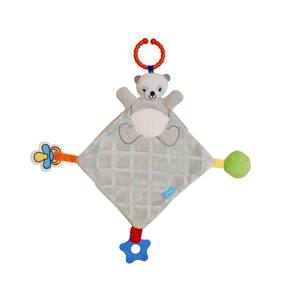 Suporte para chupeta - mantém a chupeta sempre à mão, evitando que se perca; Mordedor - para aliviar o desconforto da dentição; Pompom com tecido super macio - uma opção divertida e agradável ao toque para o bebê.