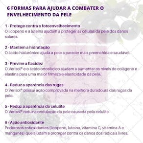 Os peptídeos bioativos de colágeno hidrolisado com peso molecular médio de 2kda auxiliam na saúde da pele. A vitamina c auxilia na formação do colágeno. A vitamina c e o manganês são antioxidantes que auxiliam na proteção dos danos causados pelos radicais livres. A vitamina a contribui para a manutenção da pele.