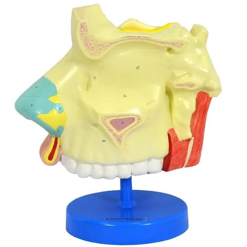 Modelo ampliado do nariz, mostra parte da estrutura óssea da face, dentes, cartilagem, cavidade nasal, nervos e músculo, com 33 pontos numerados para estudo. Confeccionado em resina plástica, desmontável em até 2 partes, montado sobre base. Composto por: Nariz ampliado com estrutura óssea da face e cavidade nasalO modelo TZJ-0310-A permite: Estudo na anatomia do nariz e cavidade nasofaringe. Visualizar parte óssea da face e as suturas: nasomaxilar, frontomaxilar, frontonasal e o osso nasal. Visualizar cartilagem do nariz representada pela cor azul no modelo. Visualizar seio frontal, bulbo olfatório, concha nasal media, inferior, seio esfenoidal e recesso faríngeo.Acompanha: Manual do usuário em português Embalagem: caixa de papelão Garantia: 1 anoMedidas: 32 x 26 x 13 cmPeso: 1,900 kg.