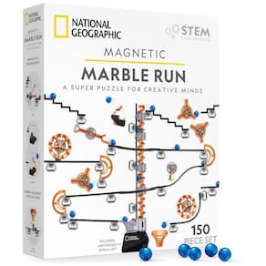 Este conjunto de construção magnética de mármore da marca Blue Marble, patenteado e apoiado por milhares no Kickstarter, é um verdadeiro sucesso! Com uma pista e truques únicos, você pode ajustar e adicionar novos caminhos emocionantes. Inclui elevador motorizado, 70 conectores de pista, 32 peças especiais, 25 mármores e muito mais para infinitas combinações e diversão criativa. Construa em superfícies magnéticas verticais, como geladeiras, armários e lousas. Conectores de encaixe seguro e instruções detalhadas tornam a montagem fácil. Vencedor do prêmio Toy of the Year Award!