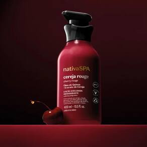 Com o exclusivo Acorde Sexy Cherry e o efeito pele de cereja, Nativa Spa Cereja Rouge é a linha que trará o seu lado mais sensual à tona. O efeito pele de cereja é a combinação do Óleo De Quinoa + Extrato De Cereja que entrega melhora na textura e firmeza da pele, alisando e suavizando o toque.
