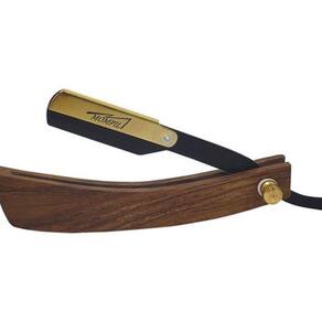 Uma Navalhete de Barbear inox, com cabo de madeira Código: MN-500 Cor: Navalhete inox, cor preta com clip dourado e cabo madeira. Material: Aço Inoxidável e madeira, Uso: Profissional: barbeiros (a), cabeleireiros (a). Utilizar lâmina de barbear descartável (tipo gillette). Pode utilizar em autoclave ou estufa, obedecendo o tempo e temperatura padrão.