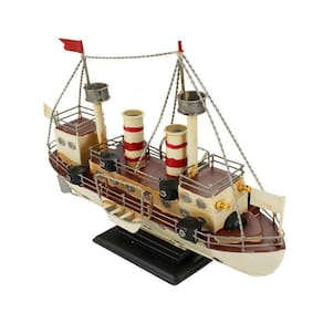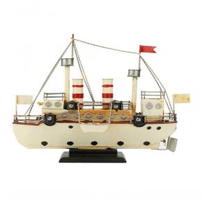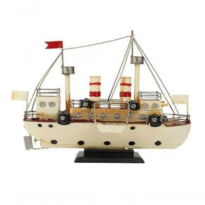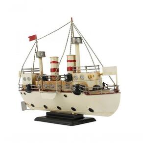 Enfeite decorativo em forma de um navio branco com 28 x 10 x 33 cm de dimensão,