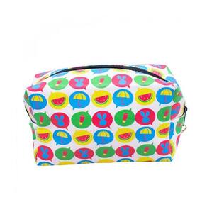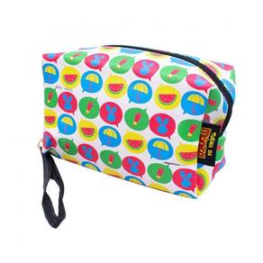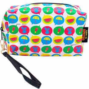 Necessaire com 12.5 x 8 x 22 cm de dimensão, com estampa colorida com símbolos da Turma da Mônica como melancia da Magali, Sansão, guarda chuva do Cascão.