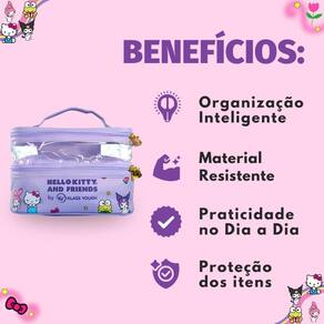 Benefícios PrincipaisA Necessaire Dupla Hello Kitty and Friends é perfeita para organizar seus itens. Utilize os compartimentos para separar os produtos por tipo, facilitando o acesso e evitando bagunça. Ideal para viagens, trabalho ou uso diário. Experimente organizar seus itens por cor ou função para otimizar ainda mais o uso da necessaire.