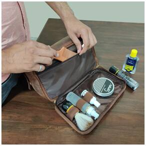 Bolsa de Toalete de Couro Elegante e Luxuosa Facilita a preparação durante a viagem zena desodorante, creme de barbear, navalha, colônia, pente e muitos mais itens Interior espaçoso com forro impermeável durável Um companheiro perfeito em qualquer viagem que pretenda fazer. A Rustic Town está conectada com várias organizações na Índia que trabalham para trazer empregos para os artesãos e manter vivas as habilidades tradicionais Marca: Não Informado