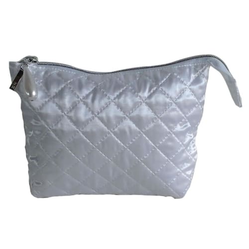 Necessaire matelasse branca tamanho médio com fechamento em zíper. Prático e versátil, ele organiza e armazena seus produtos de beleza, ideal para o dia a dia.