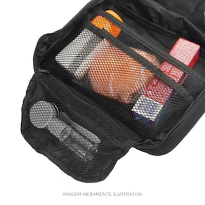 Compacta e portátil, é feita com material leve e resistente. Possui separações com telas que facilitam a visualização, fechamento em ziper e cabide para pendurar em barracas, banheiro de hoteis o que torna o produto ainda mais prático.