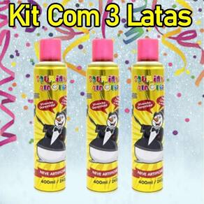 Neve artificial 3 latas spray espuma carnaval slime alegria Kit com 3 latas de espuminha carnaval em spray 400ml - espuma carnaval Neve artificial Espuma branca semelhante a flocos de neve para festas. Alcançe: até 3 metros. Instruções de uso: - agite bem antes de usar. - pressione a válvula para dar vazão ao produto. Nunca usar a lata de cabeça para baixo. Conteúdo: 3 latas de 400ml / 240g Marca: Linha Da Alegria