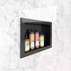 Nicho embutido fabricado em PSAI preto com acabamento brilhante, ideal para banheiros. É a solução perfeita para organização, design e praticidade no seu banheiro. Resistente à umidade e de fácil limpeza, seu design minimalista complementa diferentes estilos de decoração.