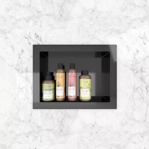 Nicho embutido fabricado em PSAI preto com acabamento brilhante, ideal para banheiros. É a solução perfeita para organização, design e praticidade no seu banheiro. Resistente à umidade e de fácil limpeza, seu design minimalista complementa diferentes estilos de decoração.