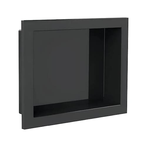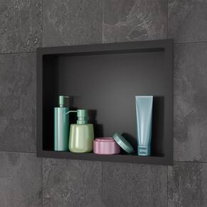 Nicho embutido fabricado em PSAI preto com acabamento brilhante, ideal para banheiros. É a solução perfeita para organização, design e praticidade no seu banheiro. Resistente à umidade e de fácil limpeza, seu design minimalista complementa diferentes estilos de decoração.