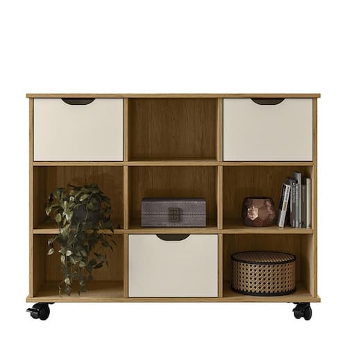 Nicho Organizador 1478 com 3 Gavetas - Qmovi O Nicho Organizador foi pensado para facilitar o processo de organização. É um produto muito prático que pode ser utilizado em diversos ambientes como quarto infantil, sala de estar e escritório. Ele possui 9 compartimentos internos que contribuem para organização do local e rodízios que facilitam a locomoção. Acompanha Kit com 3 Gavetas, um módulo opcional que foi feito para incrementar o Nicho Organizador, melhorando sua divisão interna e dando mais beleza e praticidade ao seu ambiente. As gavetas contam com fitas de feltro na parte inferior para não danificar o móvel.