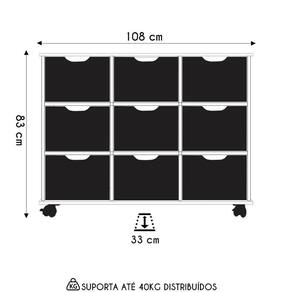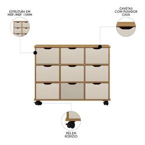 Altura: 83 cm | AssemblyRequired: Sim, sugerimos a contratação do nosso serviço de montagem (para os CEPs em que o serviço está dispon | Color: Freijó | ColorFamily: Freijó | ColorSimple: Freijó | ColorSupplier: Freijó | Cor: FreijóOff White | Gênero: Unisex | Largura: 108 cm | Manual: Sim | Material: MDF | MaterialFamily: MDF | Model: Qmovi | Origem: | OriginCountry: | OriginState: PR | Peso: 49 kg | ProductContents: 1 Nicho e 9 Gavetas | ProductHeight: 83 | ProductInstructions: Produto para uso em ambiente interno, nao devendo ficar exposto ao sol, calor e umidade excessivos. | ProductLength: 33 | ProductWarranty: 90 dias após o do produto | ProductWeight: 49 | ProductWidth: 108 | Profundidade: 33 cm | Requere montagem: Sim | SizeDescription: 83 x 108 x 33 cm | SupplierSimpleName: Nicho Organizador 9 Gavetas com Rodízios FreijóOff White - Qmovi