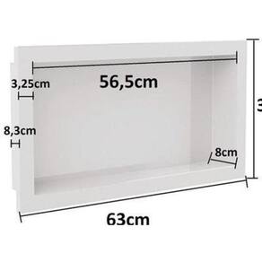 Nicho para banheiro em Plastico de Engenharia 30x60 cm Produto em alto brilho e longa durabilidade. Praticidade, organização e economia para a sua Obra Produzido em Plastico de Engenharia, o nicho de parede Metasul tem acabamento brilhoso e a resistência ideal para o dia a dia. Possibilidade de instalação rápida e fácil, substituindo os onerosos nichos cerâmicos e porcelanatos. Já vem pronto pra instalar. Medidas 60 cm Largura 30 cm Altura 08 cm Profundidade Medidas Exatas Exterior da Moldura 63cm x 33 cm Interno 56,50 cm x 26,50 cm Profundidade 8 cm Vista Borda aparente : 3 cm : 1 ano contra defeitos de fabricação Como instalar: 1- Corte o gabarito indicado pela linha pontilhada no fundo da embalagem , marque a área a ser perfurada e escave a parede de modo que a profundidade do buraco fique maior que a profundidade do Nicho aproximadamente 70mm . 2- Coloque o nicho no local perfurado e verifique se o mesmo encaixou corretamente. Com auxílio de medidor de nível verifique se o nicho não está torto ou fora de nivelamento, corrigindo se necessário. 3- Caso esteja tudo de acordo, retire o nicho e aplique uma camada de massa para fixação de piso cerâmico no fundo da cavidade do buraco. Espalhe a massa de maneira uniforme com auxílio de uma desempenadeira ou colher de pedreiro. 4- Aplique uma camada de silicone no verso da moldura do nicho, colocando uma maior quantidade nos cantos. 5- Instale o nicho no local e com um auxílio de um martelo de borracha branco, bata no fundo e nas laterais do nicho para melhor acomodação da massa e remoção de espaços vazios. 6- Confira novamente o nivelamento e aplique uma camada de silicone branco ou incolor para fazer acabamento. Limpe o excesso com auxílio de um pano branco úmido e aguarde 24 horas para total cura e utilização do produto. Marca: Não Informado