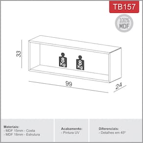 Características: Estrutura 100% MDF Acabamento em Pintura UV Detalhes em 45° Design Minimalista Estilo Industrial Necessita de Fixação na Parede