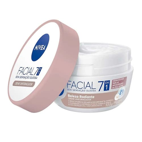 NIVEA Hidratante Facial 7 em 1 Beleza Radiante é um creme hidratante desenvolvido especialmente para atender às necessidades da pele negra.