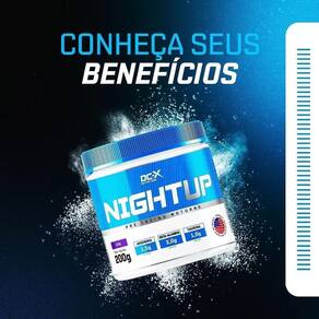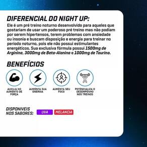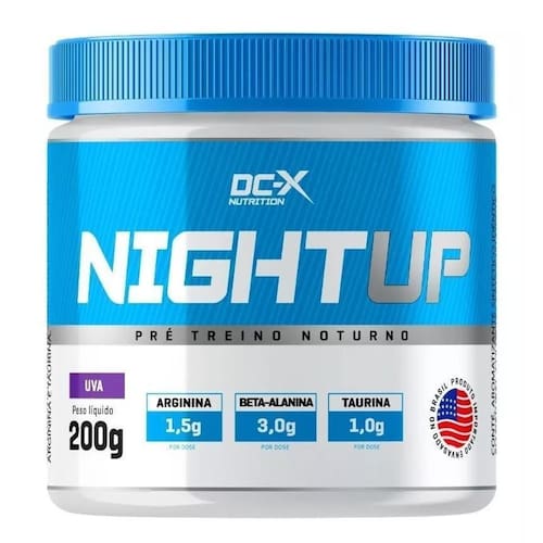 Este produto não é é um suplemento alimentar. Produto em conformidade com a rdc 240 de julho de 2018. Night up night up é um pré treino noturno desenvolvido para aqueles que gostariam de usar um poderoso pré treino mas não podiam por serrem hipertensos, terem problemas com ansiedade ou insonia e buscam disposição e energia para treinar no período noturno, pois ele não possui estimulantes energéticos. Sua esclusiva fórmula possui 1500mg de arginina, 3000mg de beta-alanina e 1000mg de taurina. Ingredientes: beta-alanina, matodextrina, arginina, taurina, vitamina b3 niacinamida , vitamina b5 pantotenato de cálcio , vitamina b2 riboflavina , vitamina b6 piridoxina hcl , vitamina b12 cianocobalamina , aromatizantes idênticos ao natural, acidulante ácido cítrico, edulcorante stevia e corante aritificial vermelho ponceau. Não contém glúten. Alérgicos: pode conter leite, soja e ovo. Diabéticos: contém maltodextrina. Validade - 05/11/2024 Marca: Dc-X Nutrition