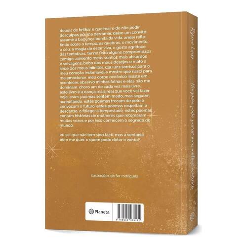 da autora dos best-sellers tudo nela brilha e queima e jamais peço desculpas por me derramar depois de brilhar e queimar e de não pedir desculpas por me derramar, deixo um convite: assumir a bagunça bonita da vida. andei refletindo sobre o tempo, as quebras, o movimento, o céu, a magia de estar viva, o gosto agridoce das tentativas. tenho feito alguns compromissos comigo. alimento meus sonhos mais absurdos e selvagens. bebo dos meus desejos e mato a sede dos meus infinitos. dou uns sorrisos para o meu coração indomável e mostro que nasci para me emocionar. meu corpo oceânico insiste em acontecer. observo minhas falhas e elas não me dominam. choro um rio cada vez mais livre. este livro é a dança mais real que você vai fazer hoje. estes poemas sentem medo, mas seguem acreditando. estes poemas trocam de pele e convocam o futuro. estes poemas respeitam o descanso, o fôlego, a tempestade. estes poemas contam histórias de mulheres que retornaram muitas vezes e por isso conhecem o segredo do mundo. eu sei que não tem sido fácil, mas a ventania bem me quer. e quem pode deter o vento? ilustrações de Fer Rodrigues