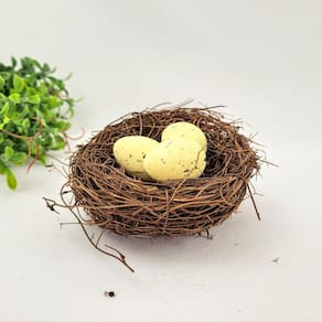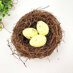 Estilo Natural: O ninho é confeccionado em cipó, transmitindo uma aparência rústica e autêntica. Adornos Delicados: Contém três ovos de isopor medindo 3,5x2,5 cm, que se encaixam perfeitamente no ninho. Dimensões Ideais: Com uma altura de 5 cm e diâmetro de 12 cm, é leve com apenas 25g, fácil de manusear.