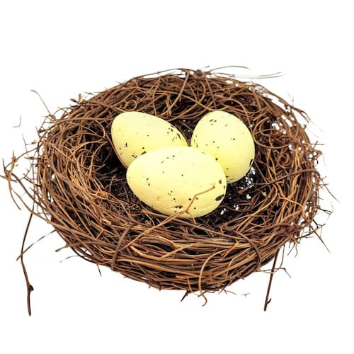 Estilo Natural: O ninho é confeccionado em cipó, transmitindo uma aparência rústica e autêntica. Adornos Delicados: Contém três ovos de isopor medindo 3,5x2,5 cm, que se encaixam perfeitamente no ninho. Dimensões Ideais: Com uma altura de 5 cm e diâmetro de 12 cm, é leve com apenas 25g, fácil de manusear.