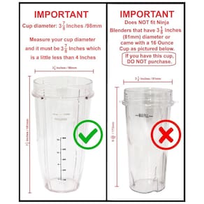 Para garantir que estes sejam os copos corretos para o seu liquidificador, preste mais atenção aos tamanhos nas imagens e na descrição. Estes copos têm um diâmetro de 9,8 centímetros. Meça o diâmetro do seu copo e deve ser cerca de 9,8 centímetros, que é um pouco menos que 10 centímetros. Não serve em liquidificadores Ninja que têm um diâmetro de 7,9 centímetros ou que vieram com copos de 473 ml.