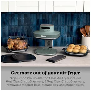 O Ninja Crispi Pro AS101DG é um sistema de fritadeira de ar elétrica 6-em-1 com potência de 1800 W e voltagem de 120 V, equipado com base modular ajustável para potes de vidro CleanCrisp de 2,5 qt (2,37 L), 4 qt (3,78 L) e 6 qt (5,68 L), incluindo placas crispi e tampas de armazenamento com vedação snap-lock à prova de vazamentos. Oferece 6 funções programáveis: Max Crisp, Air Fry, Bake/Proof, Roast, Recrisp e Dehydrate, com controle preciso de temperatura até 232°C através de botões push-button para operação consistente.