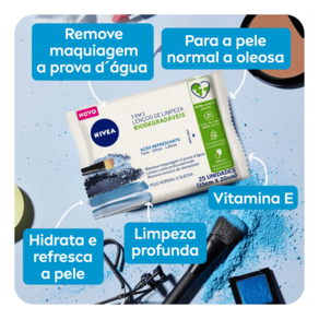 O Lenço Demaquilante NIVEA 3 em 1 Ação Refrescante proporciona uma limpeza profunda e não agressiva, que retira não apenas a maquiagem resistente, mas também a oleosidade e impurezas do dia. Conta com Vitamina E na fórmula, que ajuda a hidratar, combater os sinais de envelhecimento e deixa uma sensação deliciosa de frescor na pele.