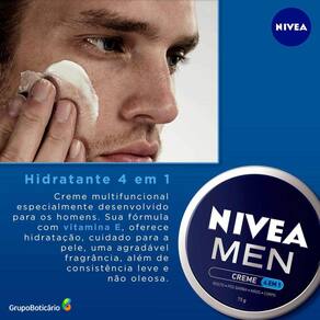 O Creme NIVEA MEN 4 em 1 é um produto multifuncional, desenvolvido especialmente para o homem moderno que busca hidratação e cuidado intenso. Sua fórmula é enriquecida com Vitamina E, tem a agradável fragrância NIVEA e consistência não oleosa. Sua consistência leve e rápida absorção, que mantém a pele macia e sequinha. Dermatologicamente testado.