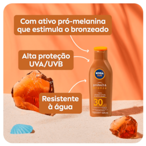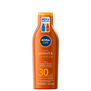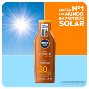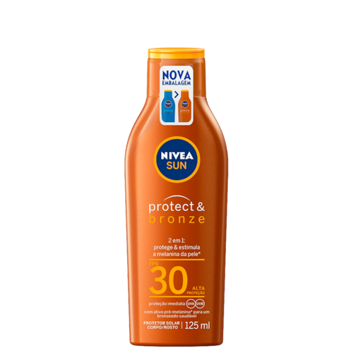 Protetor solar para todos os tipos de pele. NIVEA SUN Protect & Bronze FPS 30 protege dos raios UVA/UVB e deixa a pele bronzeada, previne o envelhecimento da pele, além de estimular um bronzeado bonito e saudável por muito mais tempo.