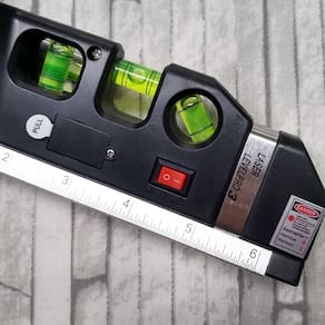 Outras características: Laser com interruptor, base com régua em alumínio de 6 polegadas e trena de aço de 2,5 metros.