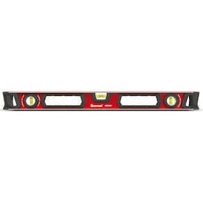 Nível feito de alumínio com perfil retangular e extremidades emborrachadas e reforçada com plástico ABS para amortecer pequenos impactos.