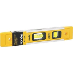 Indicado para nivelar superfícies em geral. Possui ímã que permite a realização de trabalhos com as mãos livres durante o alinhamento e ajuste de objetos metálicos. Comprimento do nível: 9 - 228 mm (22,8cm) Posição das bolhas do nível: 1 bolha vertical, 1 bolha horizontal e 1 bolha inclinada 45 Altura do nível: 40,0 mm (4cm) Largura da base do nível: 15,0 mm (1,5cm) Marca: Vonder Material: Plástico com base Magnética.