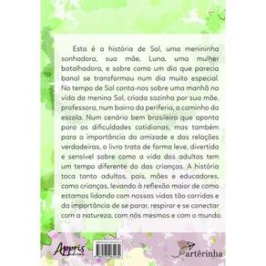 Esta é a história de Sol, uma menininha sonhadora, sua mãe, Luna, uma mulher batalhadora, e sobre como um dia que parecia banal se transformou num dia muito especial. No tempo de Sol conta-nos sobre uma manhã na vida da menina Sol, criada sozinha por sua mãe, professora, num bairro da periferia, a caminho da escola. Num cenário bem brasileiro que aponta para as di?culdades cotidianas, mas também para a importância da amizade e das relações verdadeiras, o livro trata de forma leve, divertida e sensível sobre como a vida dos adultos tem um tempo diferente do das crianças. A história toca tanto adultos, pais, mães e educadores, como crianças, levando à re?exão maior de como estamos lidando com nossas vidas tão corridas e da importância de se parar, respirar e se conectar com a natureza, com nós mesmos e com o mundo.