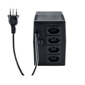Saída Fator de potência: 0,5 Tensão nominal de saída*: 120 V Regulação da tensão Modo Rede: 120V~ ±10%/ Modo Bateria: 120V ±5% Tempo de transferência: <10 ms Frequência no modo Bateria: 50 / 60 Hz ±1 Hz Forma de onda no modo Bateria: Semissenoidal (retangular) Tomada (NBR 14136): 4 tomadas de 10 A Proteção contra sub/sobretensão: Passa a operar no modo Bateria Proteção contra descarga da(s) bateria(s): Até 10,5 V Proteção contra sobrecarga na saída Modo Rede: fusível rearmável Modo Bateria: limitador de corrente interno