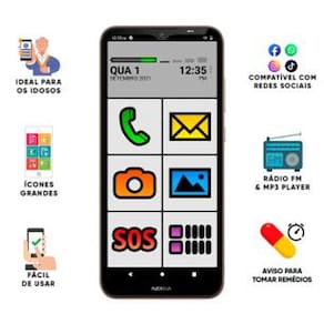 Descrição do produto: O Nokia C20 NK039 é um smartphone prático e de fácil utilização, desenvolvido com recursos de acessibilidade e segurança que facilitam o dia a dia do usuário. Possui interface simplificada com ícones e letras em tamanho ampliado, botão de emergência (SOS) configurável e aplicativo de lembrete de compromissos e horários. Além disso, conta com câmeras frontal e traseira de 5MP com flash, bateria de longa duração e 32GB de memória interna.