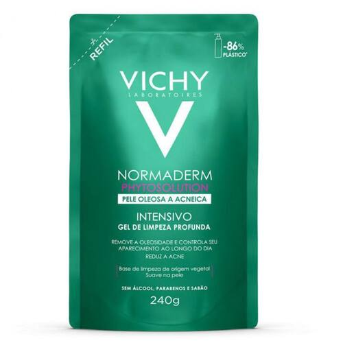 Gel de limpeza para peles oleosas e acneicas. Vichy Normaderm Phytosolution Intensivo remove as impurezas profundamente, sem agredir a pele.