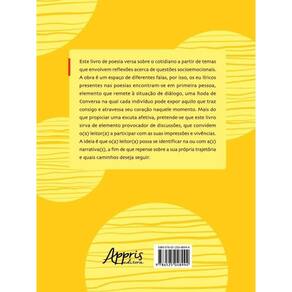 Este livro de poesia versa sobre o cotidiano a partir de temas que envolvem reflexões acerca de questões socioemocionais. A obra é um espaço de diferentes falas, por isso, os eu líricos presentes nas poesias encontram-se em primeira pessoa, elemento que remete à situação de diálogo, uma Roda de Conversa na qual cada indivíduo pode expor aquilo que traz consigo e atravessa seu coração naquele momento. Mais do que propiciar uma escuta afetiva, pretende-se que este livro sirva de elemento provocador de discussões, que convidem o(a) leitor(a) a participar com as suas impressões e vivências. A ideia é que o(a) leitor(a) possa se identificar na ou com a(s) narrativa(s), a fim de que repense sobre a sua própria trajetória e quais caminhos deseja seguir. Marca: Não Informado